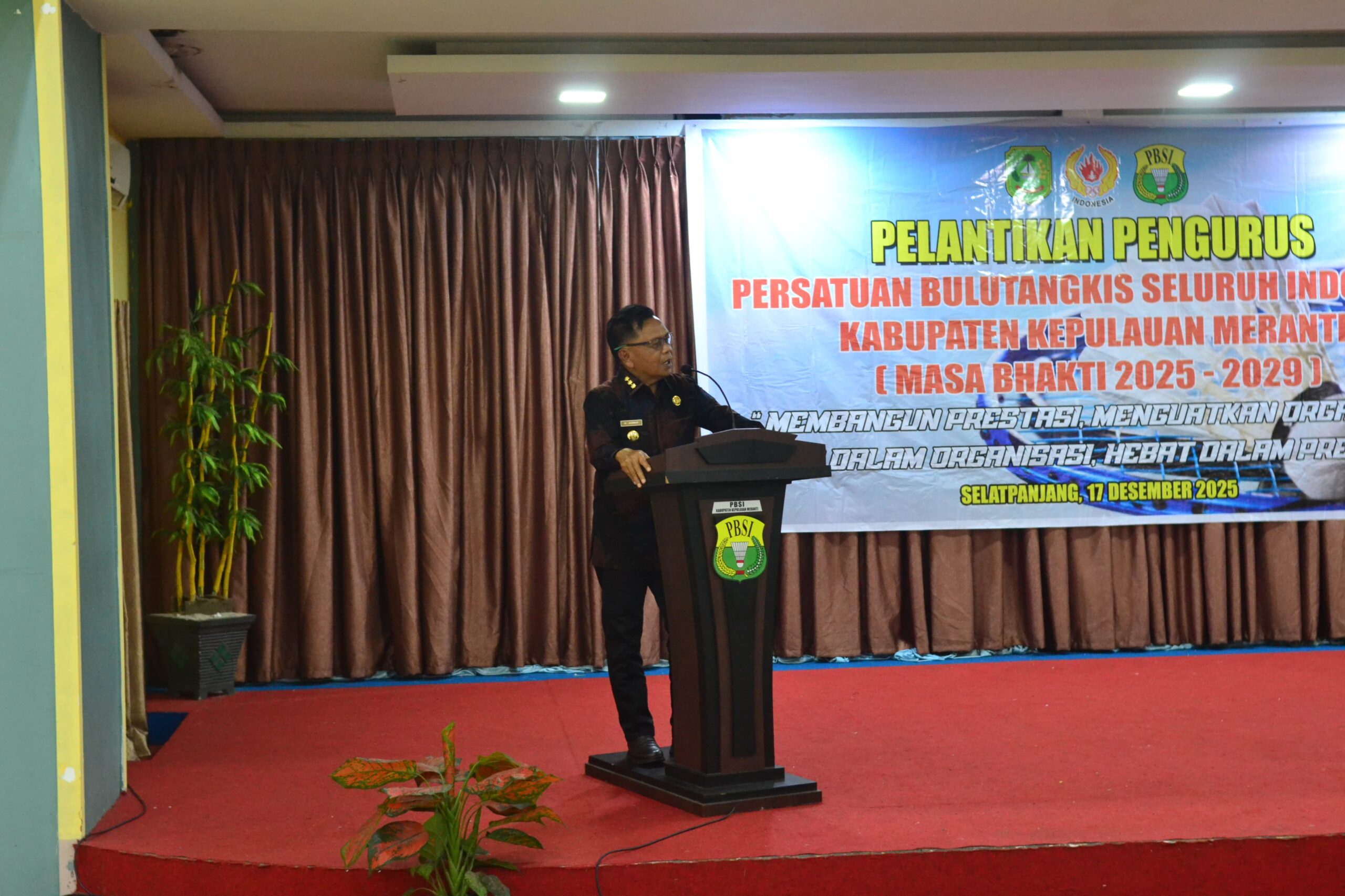 MERANTI โ€” Bupati Kepulauan Meranti, AKBP (Purn) H. Asmar, menghadiri secara langsung pelantikan Pengurus Kabupaten Persatuan Bulutangkis Seluruh Indonesia (PBSI) Kepulauan Meranti periode 2025โ€“2029 yang digelar di Ballroom Afifa Futsal Lantai 2, Jalan Banglas, Selatpanjang, Rabu (17/12/2025).