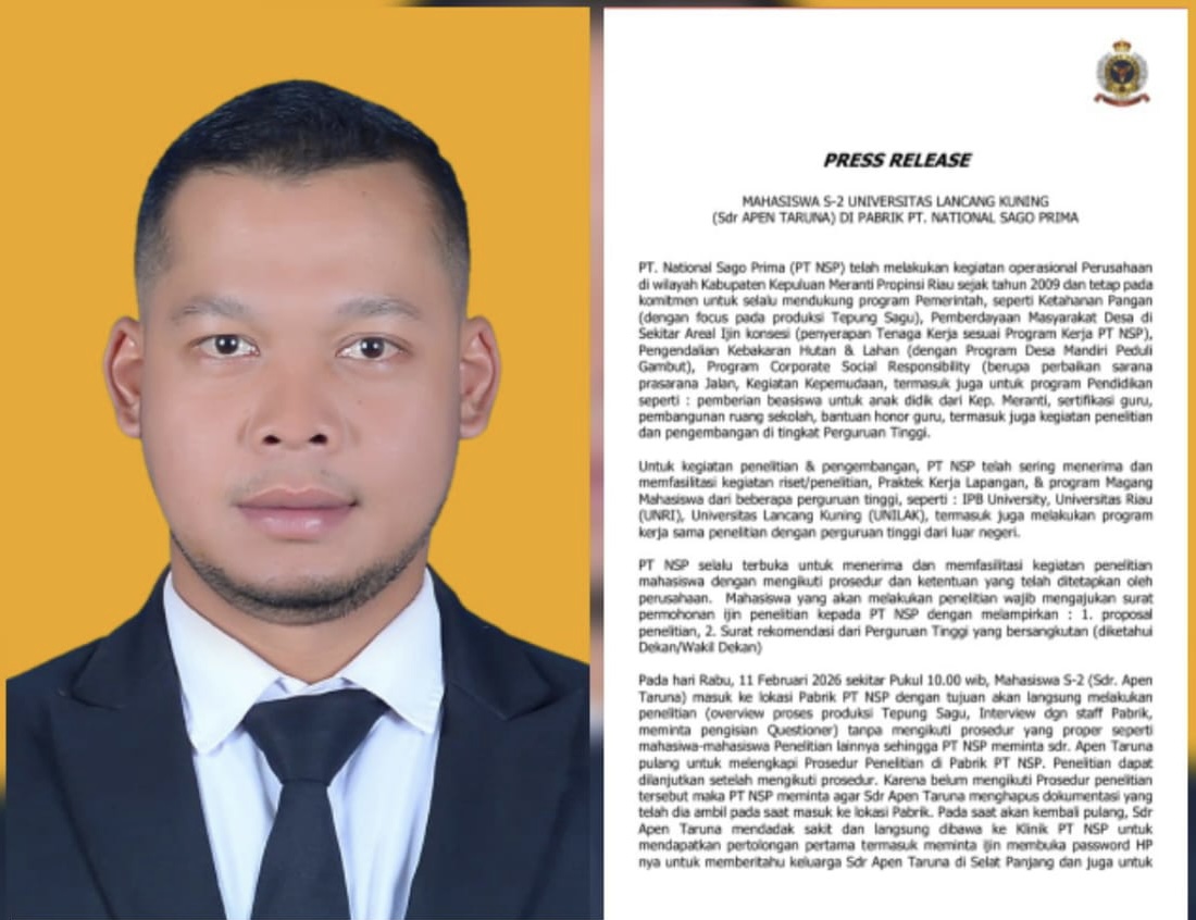 Aven Taruna,Seorang mahasiswa Program Magister (S2) Ilmu Lingkungan Universitas Lancang Kuning (Unilak), Apen Taruna, mengaku aktivitas penelitian lapangannya di area operasional PT Nasional Sago Prima (NSP), Kecamatan Tebing Tinggi Timur, dihentikan secara sepihak MERANTI,INFOPUBLIK24 — Polemik antara mahasiswa Program Magister Universitas Lancang Kuning (Unilak), Apen Taruna, dengan PT National Sago Prima (PT NSP) di Kabupaten Kepulauan Meranti, Riau, memunculkan perbedaan keterangan terkait prosedur penelitian dan dugaan pengelolaan limbah perusahaan.