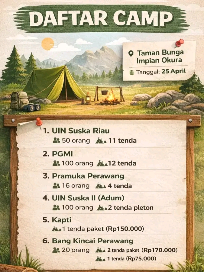 PEKANBARU,INFOPUBLIK24 – OKURA,Suasana alam yang sejuk dan pemandangan indah menjadi latar belakang kegiatan berkemping yang digelar di Taman Bunga Impian Okura pada tanggal 25 April. Acara ini dihadiri oleh berbagai kelompok yang siap menikmati pengalaman berkemah yang tak terlupakan!