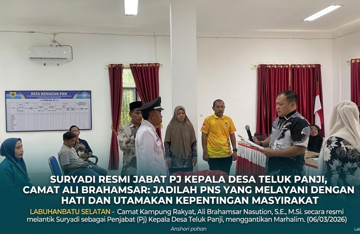 Suryadi sebagai Penjabat (Pj) Kepala Desa Teluk Panji LABUHANBATU SELATAN,INFOPUBLIK24 -Camat Kampung Rakyat, Ali Brahamsar Nasution, secara resmi melantik Suryadi sebagai Penjabat (Pj) Kepala Desa Teluk Panji, menggantikan Marhalim. Prosesi pelantikan berlangsung khidmat di Kantor Camat Kampung Rakyat, dihadiri oleh sejumlah perangkat desa, tokoh masyarakat, dan tamu undangan. Jumat (06/03/2026)